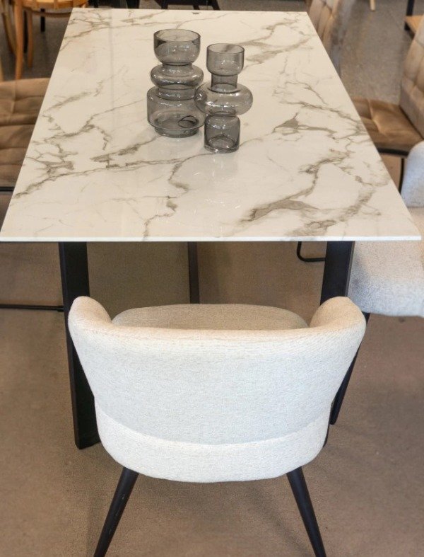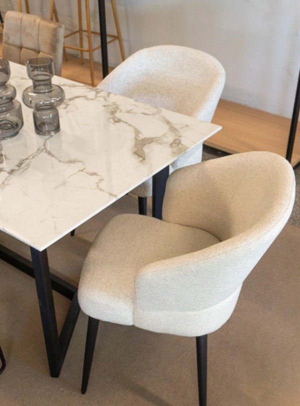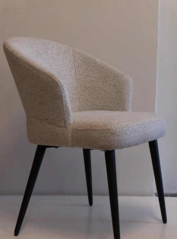 Silla tapizada en chenille de suave textura, con estructura de hierro